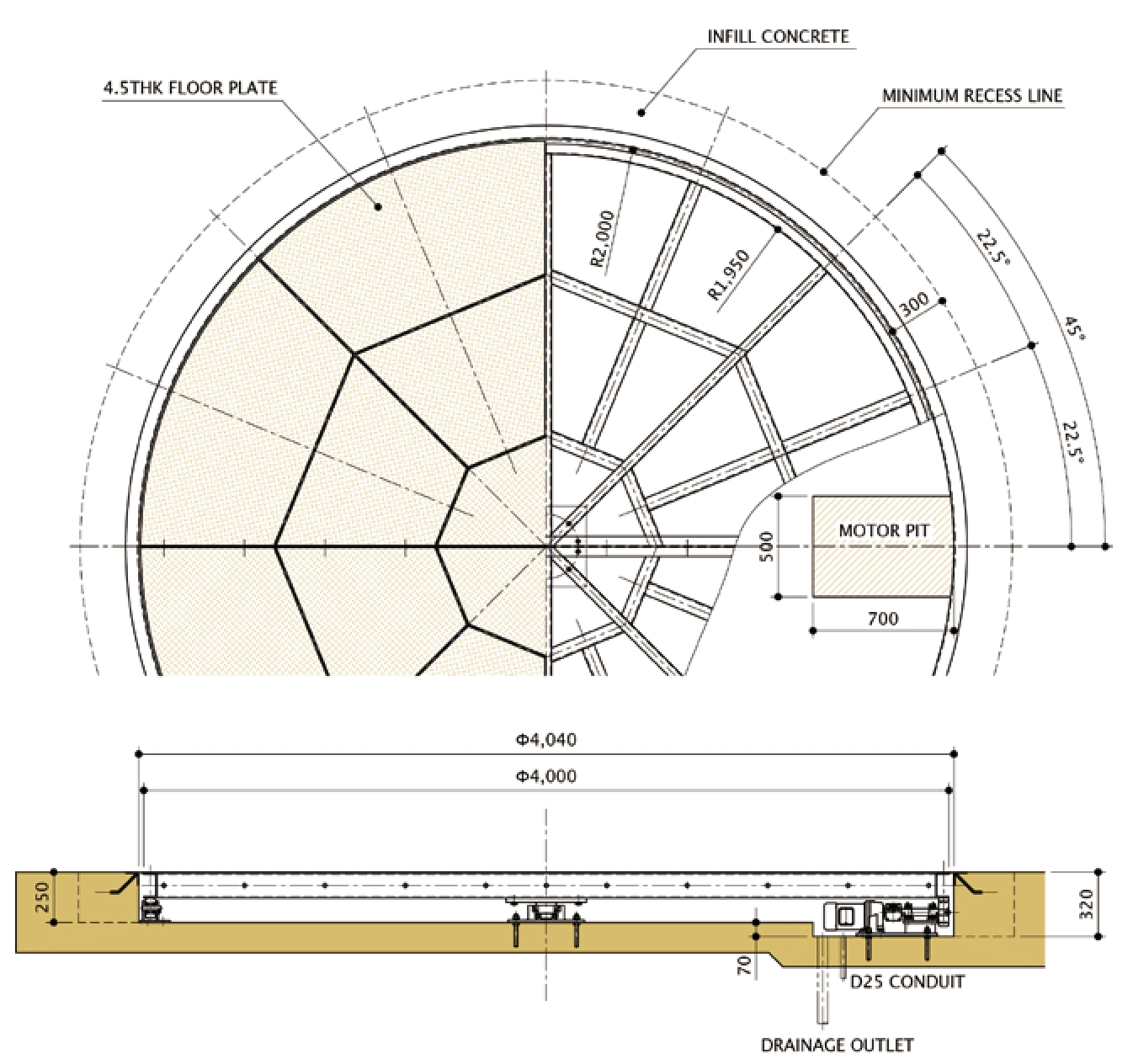 • 배수구를 포함한 250mm의 MOTOR PIT가 필요합니다.